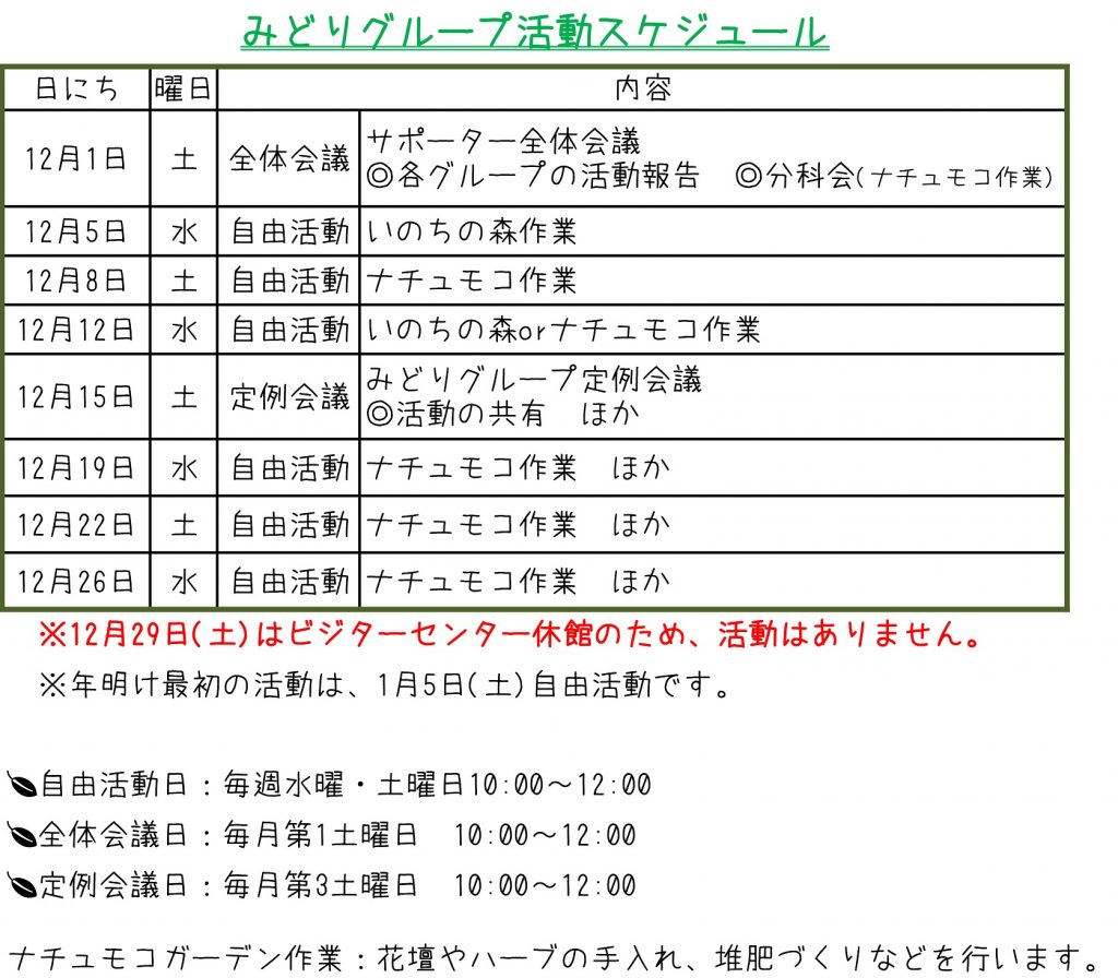12月は以下の予定で活動します。