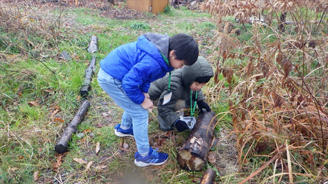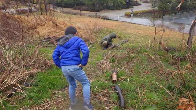 雨が止んだ隙をねらって、サンクチュアリでダンゴムシ採集からスタート。