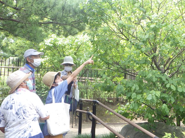 その後、帰真園を中心に見まわりをしました。エゴの結実等、自然情報の確認の他、カツラの落ち葉の香りを来園者にお伝えすることもありました。
