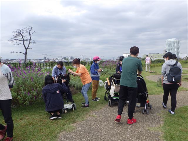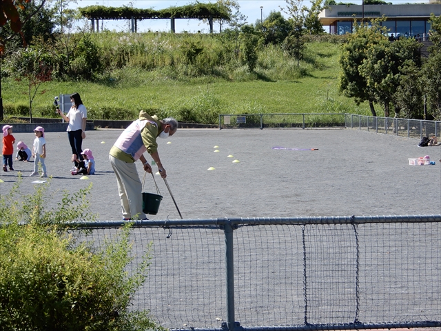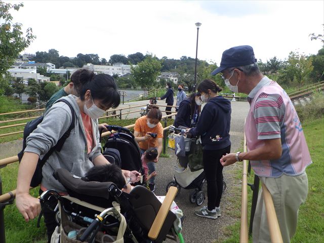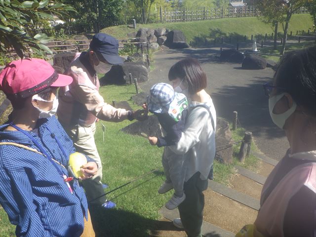 また、同日に近隣の小児科病院のお散歩に同行し園内の散策を案内しながらご一緒しました。どんぐりを拾って見せたり、チョウをつかまえたり、ナチュモコガーデンのハーブの匂いを楽しみ、土に触れてみたり、五感を使ったお散歩となりました。普段とは一味違う散策を子供たちクリニックスタッフの方も共に楽しんでいただけました。サポーターの皆さんも笑顔の活動となりました。