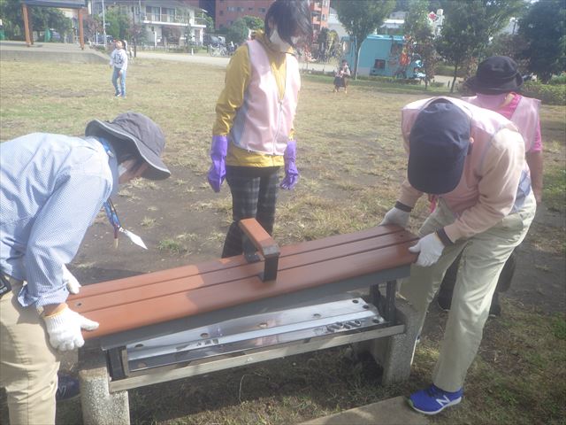 かまどベンチのメンテナンスを行いました。不具合のチェックや清掃を入念に行い、使用に支障がないようにしました。その後、園内巡回を行い、利用者とのふれあいもありました。