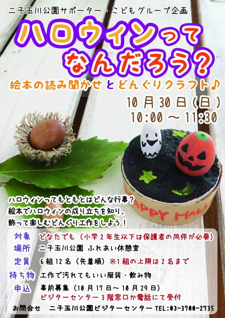 【内 容】ハロウィンをテーマにした絵本の読み聞かせとどんぐり工作を行います。