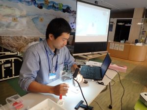 標本づくりはスタッフの手元をスクリーンに映し、手順を分かりやすく説明!