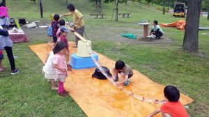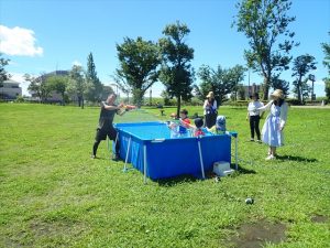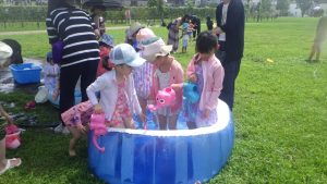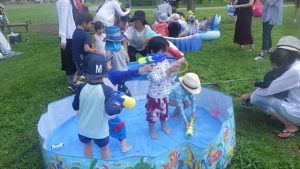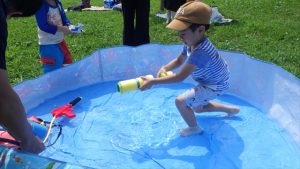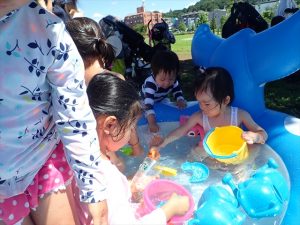 小さな子どもや女の子はぞうさんジョウロを使ったり、ビニールプールの中でのんびり水遊びが人気でした。