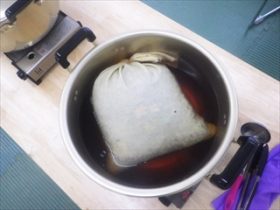 袋に入れた落ち葉からはどんどん色素が出て、レンガ色の染料液に。