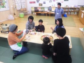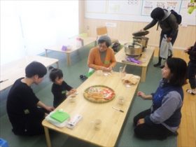 落ち葉を煮ている間に、お茶タイム。お菓子を頂きながら、交流会を実施しました。