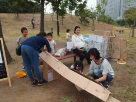 ダンボールを使った様々な遊びもできました。手作りピタゴラスイッチは親子で協力して作りましたよ!