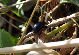 この虫は金属のような光沢をもち、今回はオスは暗青色、メスは黄褐色をしていて