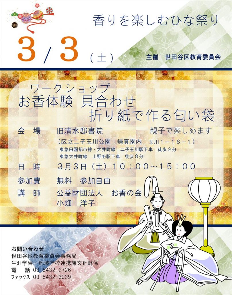 お香体験、貝合わせ、折り紙で匂い袋づくりが、親子で一緒に楽しめます。