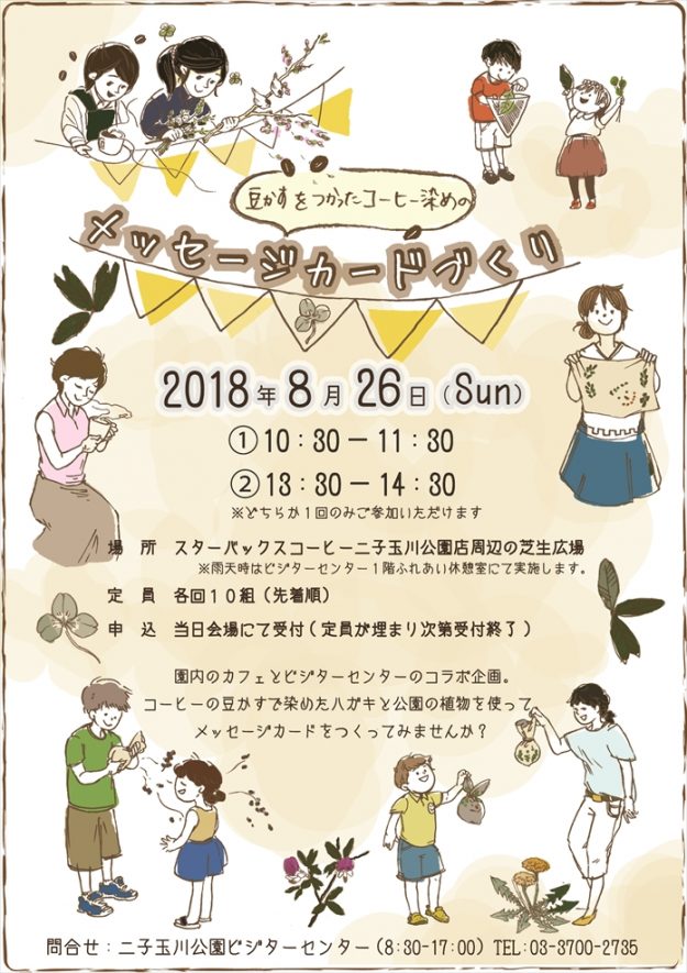 コーヒーの豆かすで染めたハガキと公園の植物を使って