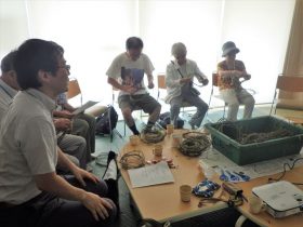 ▼今回の定例会は先日収穫したクズつるをまきながら行いました。