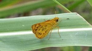 俊敏に飛び回るので写真を撮るのが大変。濃い黄色の翅が印象的で美しい。