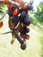しばらくすると全体的に赤くなり、皮が割れて中から種子がでてきます。