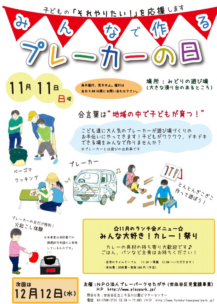 月に一度のお楽しみ、あそびの出前車「プレーカー」がやってきます。ランチ作り、木工遊びや火起しなど思い切り楽しもう!