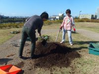 一度掘り起こして土を改良。芝を取り除いて改めて定植し、表示も設置しました。