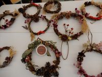 このリースはクズを土台にセンニチコウやドングリなどすべて園内での収穫物を活用したもの。