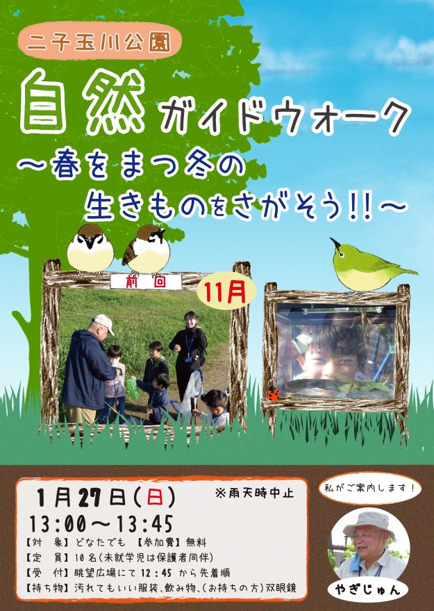 寒い日が続く1月は冬鳥をよく見かけますね。そして足元には春の草花が少しずつ見られるようになってきました。そんな春を待つ生き物たちを一緒に探しに行きませんか?どんな生きものが見つけられるかは当日までのおたのしみ。