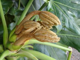 いのちの森で見つけた茶色い蕾のようなものは、じつはヤツデの木の新葉です。