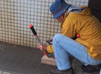 ビジターセンター内で花の名札づくり、外倉庫前では草刈り鎌などのお手入れをしました。