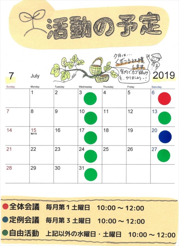 【みどりグループ】7月スケジュール Tweet ◇7月は以下の予定で活動します。 猛暑の日は、無理をせず活動しましょう・・・! 室内での作業もできると良いですね。 分からないことがあればビジターセンターまでお問い合わせください。