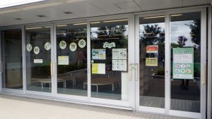 入口は園内遊具の遊び場の向かいにあります。室内の利用方法や園内のイベントの紹介も貼ってありますよ!写真左側のガラス越しに映るテーブルのコーナーが休憩スペースです。