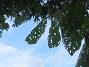 虫食いがたくさんある葉っぱの裏側から、空をのぞいたり、