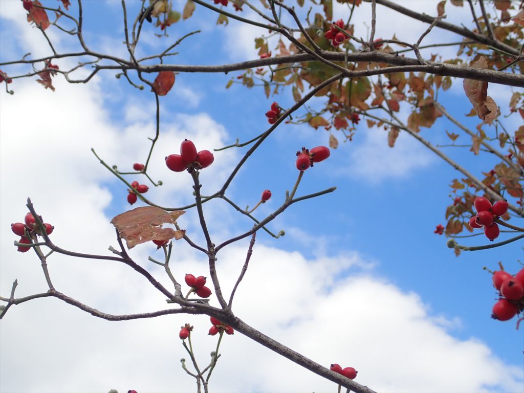 落葉が一番早かったのはハナミズキ。赤い実を空に向かって沢山つけて、葉っぱも赤く染まっています。赤色が秋の空によく映えますね。