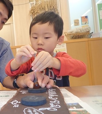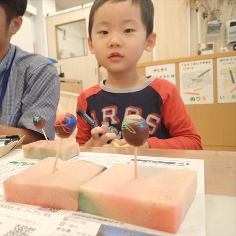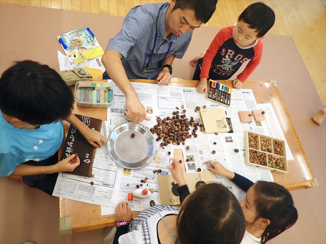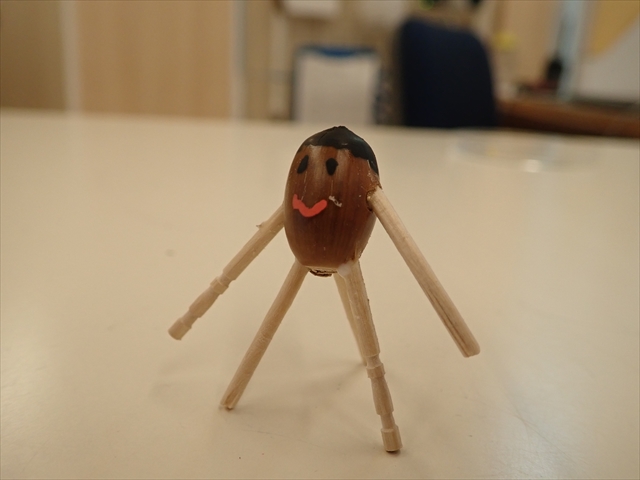10月14日(月)に1階ふれあい休憩室で実施した自然体験プログラムの様子を紹介します。今回は1階の展示とあわせて、今一押しのどんぐりを使ったプログラム「どんぐりゴマ」作りを実施しましたよ。