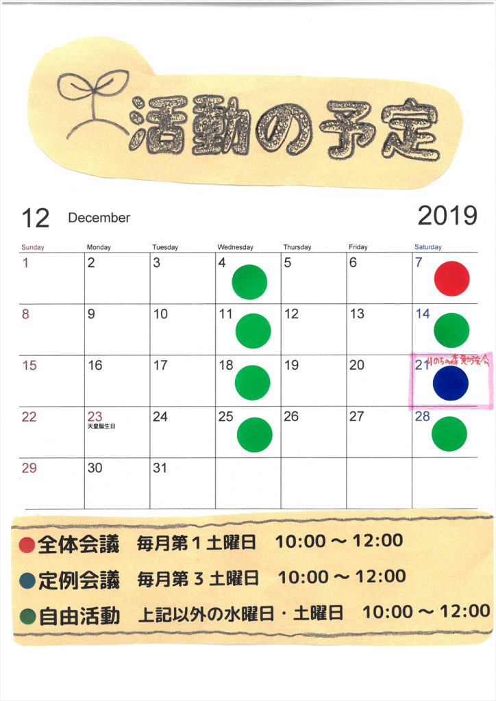 12月21日(土)の定例会議は「いのちの森勉強会」です。ご参加される方は11月30日(土)までにスタッフにご連絡ください。