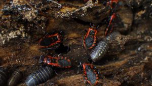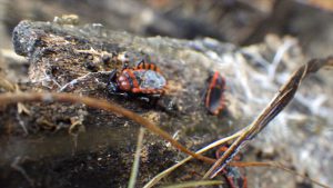 赤い虫が【アカシマサシガメ】というカメムシの仲間で、あとはみんな大好き【オカダンゴムシ】ですね。この時期は地面に面した木の隙間に潜り込むので良く見つかりますね。