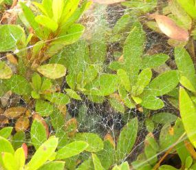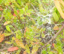 このクモの巣はタナグモの仲間で、低木の上などに巣をかけるそうです。
