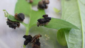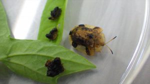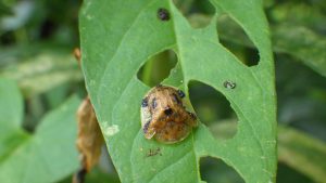 写真の葉についている糞ですが、なんとこれはヨツモンカメノコハムシの幼虫が自分の糞を背負って身を隠している姿なのです。横から見るとこんな感じです。