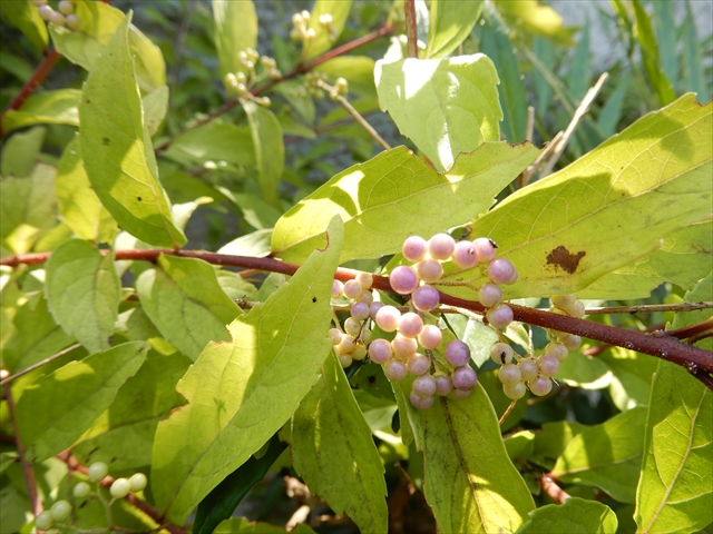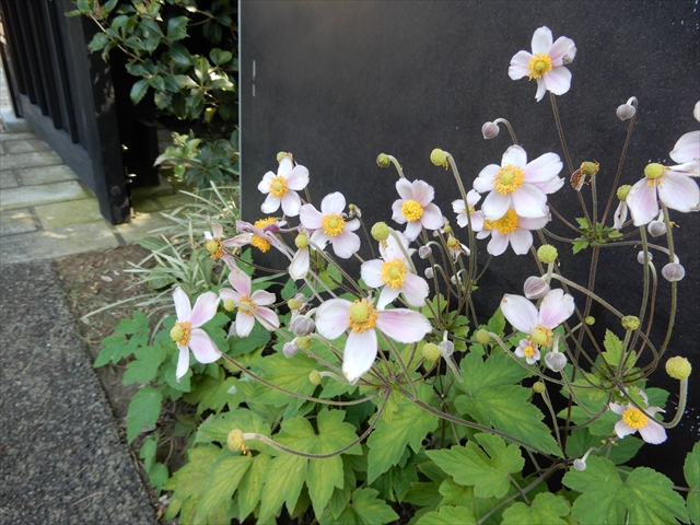 門の前ではシュウメイギクが風に揺られています。今は夏真っ盛りですが、すぐに秋がやってくるのでしょうか。コムラサキも淡く色づいてきました。