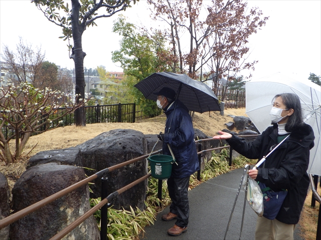 小雨の中でしたが帰真園を中心に見回り、ゴミを拾いながらミツマタやウメの開花状況を観察しました。