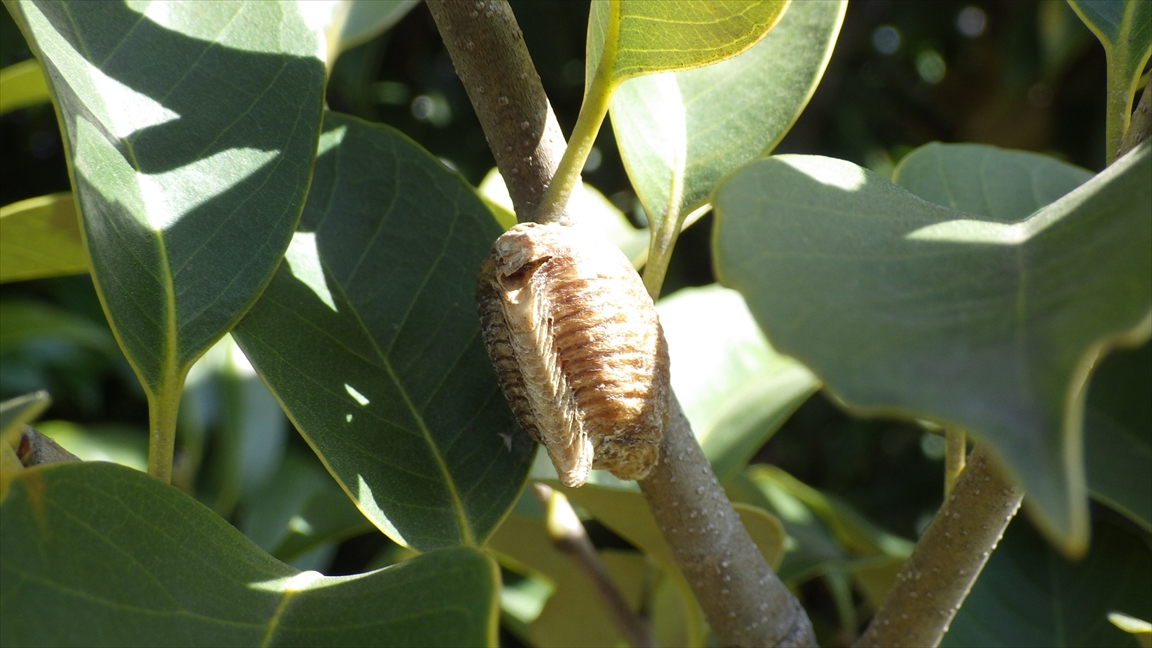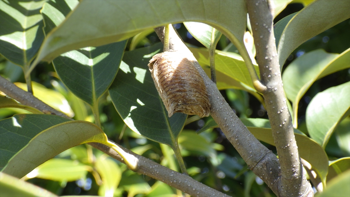 これは【ハラビロカマキリの卵鞘】です。オオカマキリのものとは異なり、卵鞘の下がツンとでるのが特徴です。
