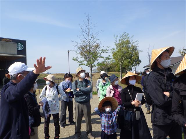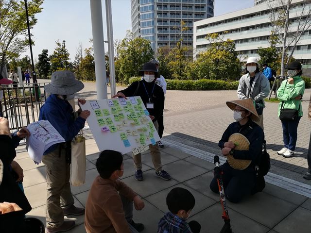 ・天気に恵まれ、桜や野の花を愛でながらの散策となりました。ルートは公園ビジターセンター~眺望広場~多摩川沿い外堤防~陸閘~二子の渡し跡~兵庫島~二子玉川駅~ライズ~ビジターセンター前とし、ひと回りしました。過去の写真と現在の風景を比較しながら歩き、感想や思い出話に花が咲きました。最後に時代別(宿場、玉電・遊園、高島屋、ライズ)にコメントをまとめ、皆さんの二子玉川の地域に対する思いを共有しました。最後に案内人のサポーターさんより「昔も今もこれからも二子玉川は都市と自然の共存を大切にしていきたい」「公園を育てるのは地域の役割」とのお話を頂き、サポーターの皆さんと共有しました。