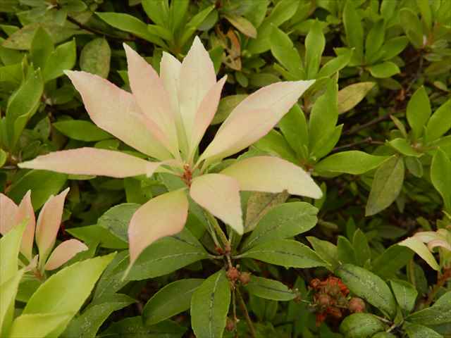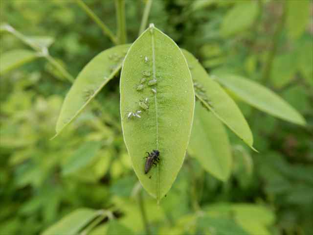 ヤマハギの新葉。アブラムシとそれを食べるテントウムシの幼虫がいました。