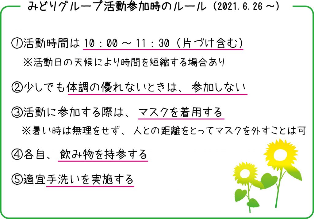 みどりグループでは引き続き以下のルールのもと、活動を継続していく予定です。