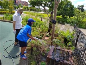 子どもたちはチョウ調べのほか、水やりも一緒に手伝ってくれました。