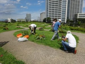 そこで花が草に覆われてしまわないよう、芝刈り機や刈込みバサミなどを使って草刈りや除草を行いました。