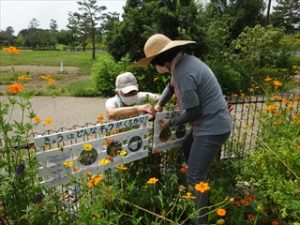 草とりや花がら摘みなどの日常管理のほか、こども花壇にやってくる主なチョウを紹介する展示を設置しました。