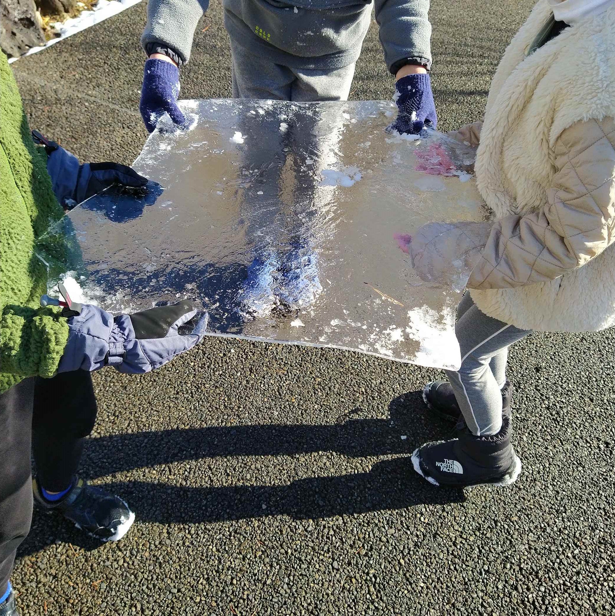 朝の巡回を手伝ってくれたサポーターの子どもたちが池の氷を取って見せてくれました。