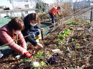 水やりや花がら摘みを中心に活動しました。雨の日がほとんどなかったので、地面がカラカラに。冬でも水やりが欠かせません。その他、間引き作業もしました。秋にまいたナノハナなどの種からたくさんの芽が出ており、密になっているところをすかしました。