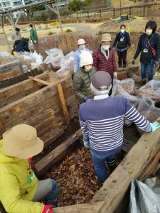 園内の落ち葉と、園内カフェから提供していただいたコーヒー豆かすを使った堆肥づくりを行いました。園内の物質循環の取り組みとして始めた堆肥作りも、今回で8回目となります。堆肥に詳しいサポーターさん主導の元、堆肥場に落ち葉や豆かすを層になるように積みあげていきます。