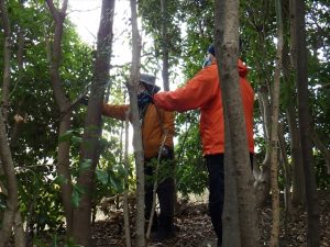 枯れた枝を取り除いたり、風などで折れてしまった枝を短く切ったりといった、お手入れをしました。作業をしていると、森の中のゴミがすごく目につきました。人が立ち入れない場所なのに、風で飛ばされたとは思えないものも…。活動中に拾ったゴミで袋が一杯になりましたが、森の中がきれいになりました!