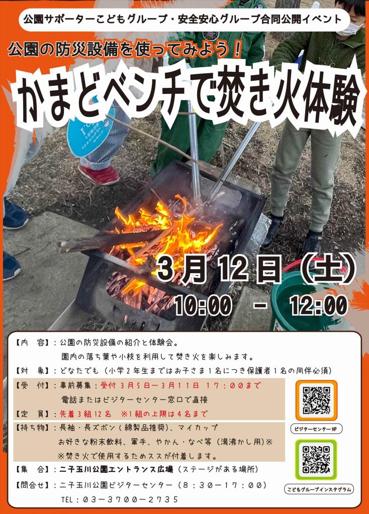 こどもグループの公開活動「公園の防災設備を使ってみよう!かまどベンチで焚き火体験」の参加者を募集致します。参加をご希望の方は以下に記載された「新型コロナウィルス感染症予防対策に関するご協力のお願い」等をご確認の上でお申し込みくださいますようお願い申し上げます。