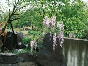 足元に気をつけて進んでみると…フジが綺麗に咲いています。庭石にもよく映えていますね。ベンチに座ってゆっくり藤の花を眺めてみるのも良さそうです。