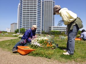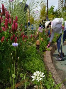 ナノハナなどの見頃が終わった花を抜き取り、これから楽しめるアサガオやヒマワリの種をまきました。また水やりや草取りなどの作業のしやすさを改善するため、レンガで足場を新たに設置しました。その他、水やりや草取りなどの日常管理を行いました。