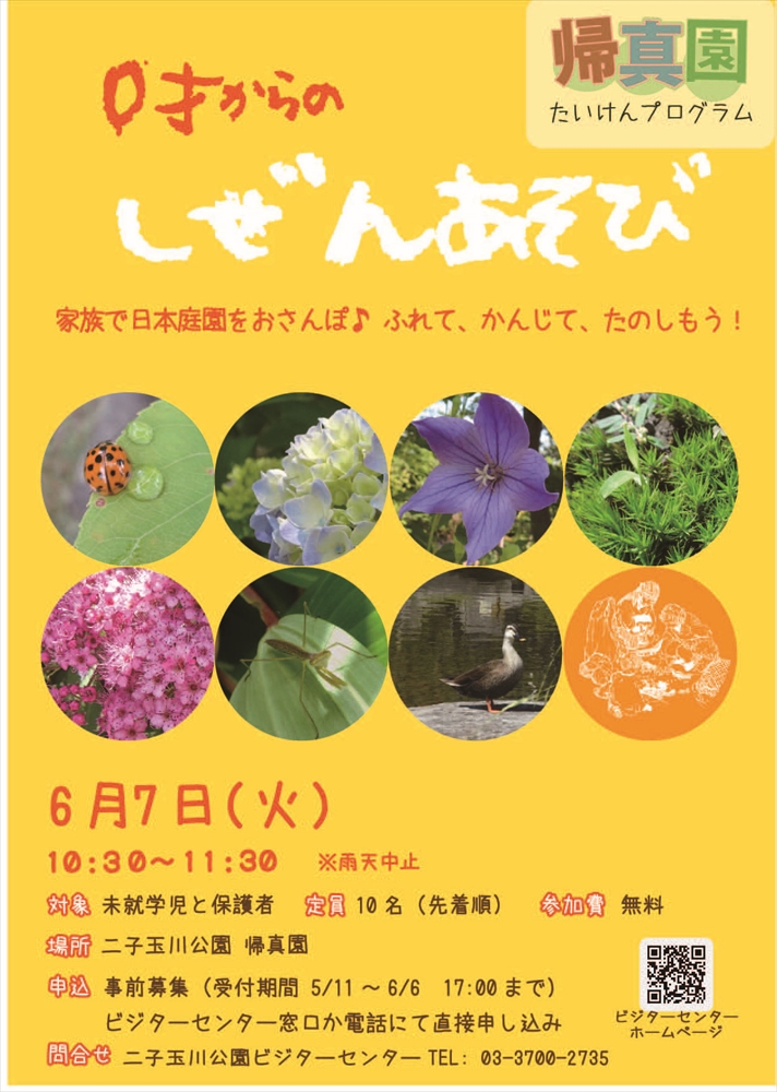 【内 容】家族で帰真園をゆっくり歩きながら、小さい子どもと過ごす日本庭園の自然の楽しみ方を体験します。 【対 象】未就学児と保護者