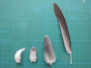 右から初列風切(翼の先の羽根)・大雨覆(翼の中央部の羽根)・体羽(背側の羽根と腹側の羽根)を用意しました。
